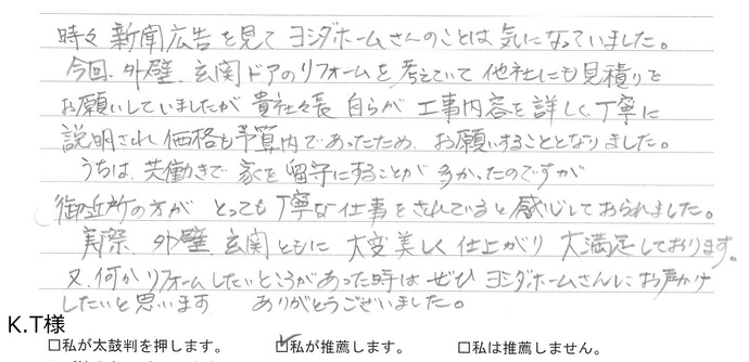 時々新聞広告を見てヨシダホームさんのことは気になっていました。今回、外壁・玄関ドアのリフォームを考えていて他社にも見積りをお願いしていましたが、貴社社長自らが仕事内容を詳しく丁寧に説明され価格も予算内であったため、お願いすることとなりました。うちは、共働きで家を留守にすることが多かったのですが、御近所の方がとっても丁寧な仕事をされていると感心しておられました。実際、外壁・玄関ともに大変美しく仕上がり大満足しております。