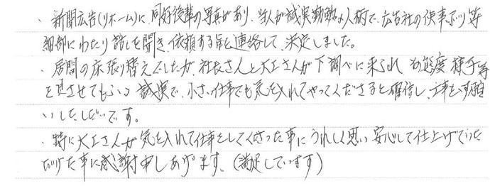 居間の床張り替えでしたが、社長さんと大工さんが下調べに来られその態度様子等を見させてもらい誠実で小さい仕事でも気を入れてやってくださると確信し、工事をお願いしたしだいです。